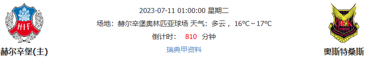 北京时间07月11日01点00分,2023瑞典甲联赛第13轮的一场比赛,奥斯特桑斯将前往赫尔辛堡奥林匹亚球场与赫尔辛堡展开较量。赫尔辛堡近期联赛中已经连续4轮保持不败,本轮回归家门口作战,其发挥值得期待。