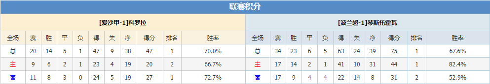 而且再考虑到,科罗拉在近期的赛程安排上并不友好,球队在需要顾及欧冠杯的同时,还需备战联赛以及国内杯赛,多线作战对球员无论是体能还是心理上都需有极高的要求。反之,琴斯托霍瓦因为波兰超新赛季尚未开打,因此球队也能将更多的精力放在欧冠的赛程上,加上首回合的优势,Yoyo结合到各项数据的指标来看,今仗更为倾向于支持琴斯托霍瓦击溃对手再下一城呀!