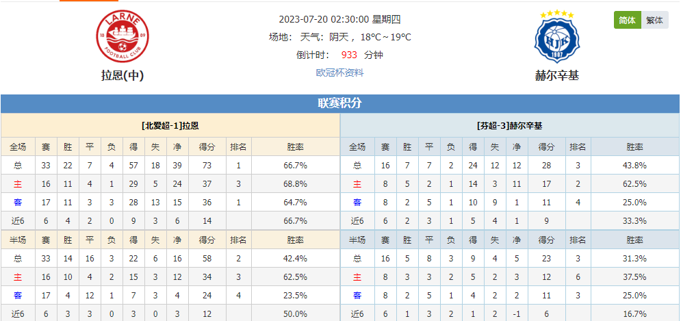 拉恩在北爱超本赛季的33轮比赛成绩为22平7平4负,以较大的优势夺取联赛冠军。目前总积分为73分,排在联赛的第1名。联赛总进球为57球,进攻端也是火热的表现,总失球为18球,他们的防线表现相当稳固。拉恩上一役联赛对战赫尔辛基,终以0:1不敌对手,在不被看好的情况下顶住压力。拉恩与赫尔辛基历史首次交战处于劣势,此役再战能否拿下佳绩?