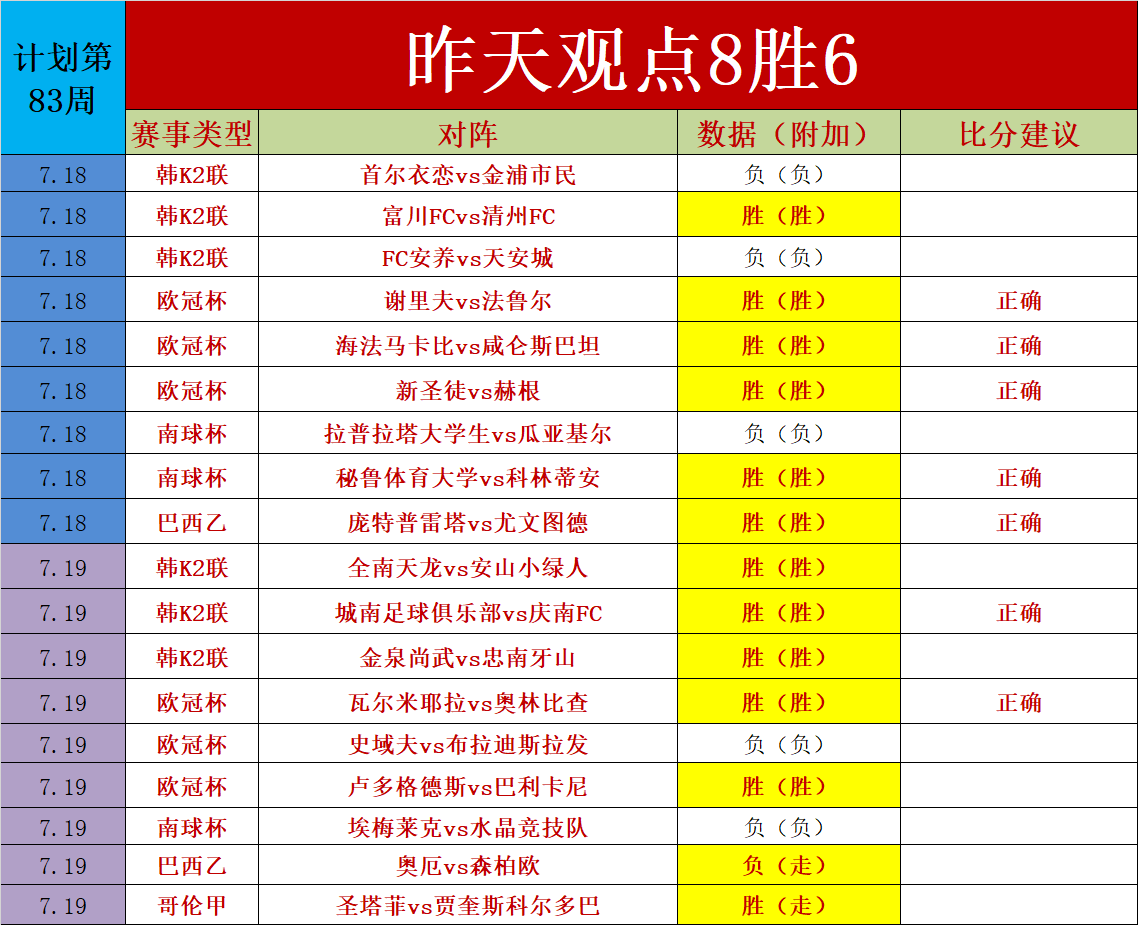 1、推演士计划第83周(走不纳入统计)昨天状态超级炸裂,昨天9场只有2场失手,观点建议拿下8胜6的战绩,击中2场 比分,韩K2联3场全胜,欧冠杯也拿下3胜2的佳绩,欧冠杯两天拿下6胜5的佳绩,重点杯赛继续。