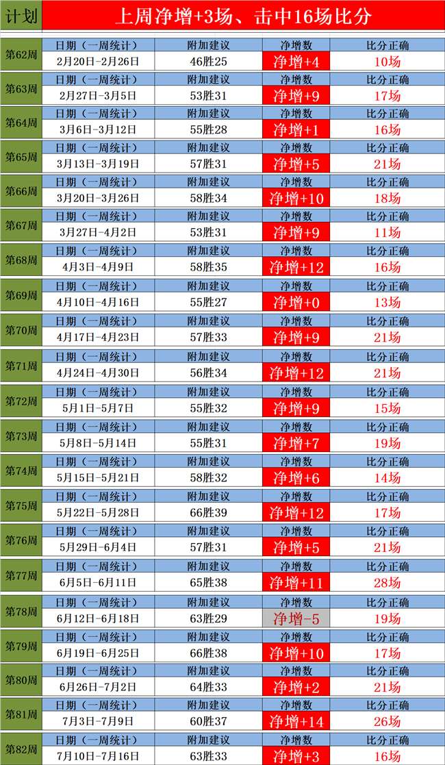 2、上周净增+3场,近31周有29周保持净增长,上周预测16场比分正确,持续的保持了高效的稳定。
