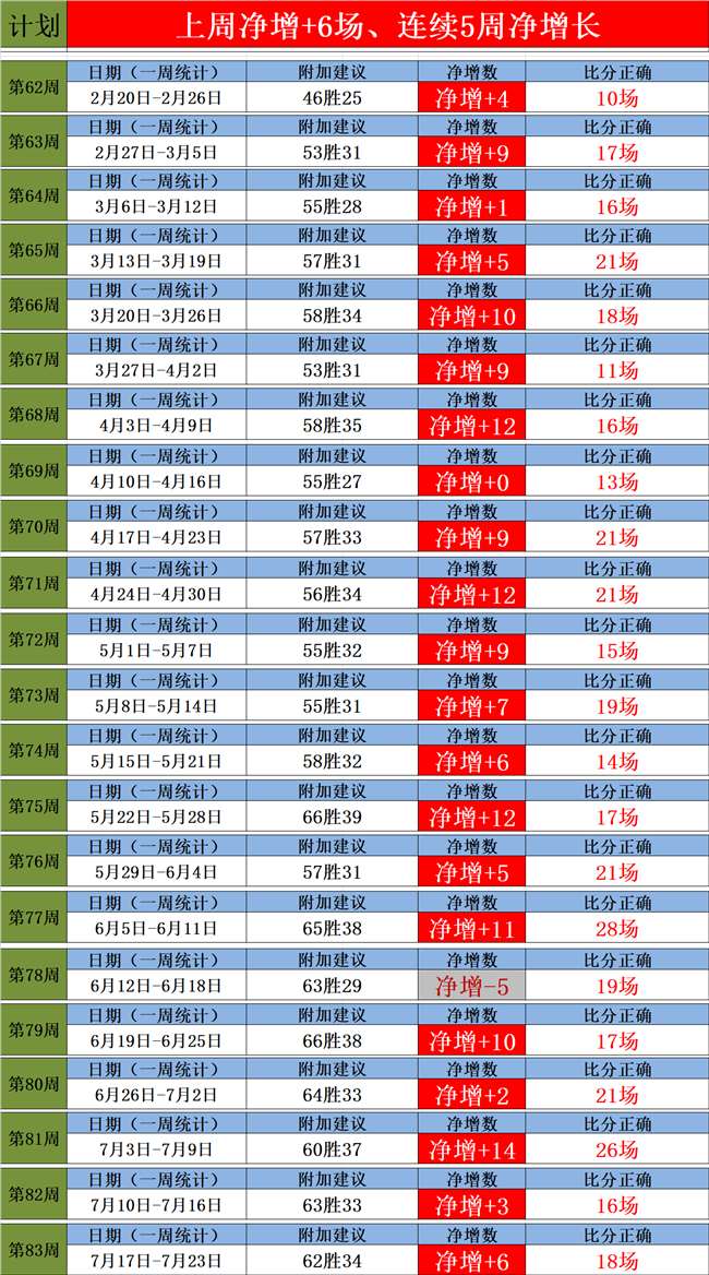 2、上周净增+6场,近32周有30周保持净增长,上周预测18场比分正确,持续的保持了高效的稳定。