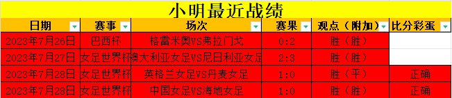 昨天2场比赛全部拿下,并且2场合计收获1030%比分!近4场比赛取胜4场,小明在两周内达成十五连胜的成就,常年保持命中率稳定,值得大家长期关注。英格兰女足1:0丹麦女足 中国女足1:0海底女足 两场比赛观点正确,附加1胜1平。英格兰给大家做烤串用,两场胜主任那边数据2.1,收获还是很不错的。中国女足从来没让我们失望过!在被罚下一人的情况下,依靠张玲艳制造的点球挑落海地。其实中国杯罚下一人也不是坏事,海地上半场全部时间都在防守,中国又把王珊珊安排在中卫,这样前场很难找到有效进攻手段。但是红牌下去以后,海地攻了出来,这样张玲艳的速度优势就能发挥。希望今天也能够分析正确,给大家带去理想的赛果。