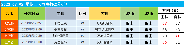 大数据栏目:本栏目将当天的赛事列出经由大数据分析得出的任何高概率选项供网友参考(期间若连续2天总胜率低于50%,将免费1期补偿)。现时大数据分析逐渐融入我们的生活当中,任何一个动作都能参照历史数据得出下一个行为是什么。足球作为一项竞技体育赛事,自然也离不开大数据的分析,在可供查找的数据中我们可以经过特殊的算法得出赛事的某些选项高频概率,而本栏目正是因此而创建。