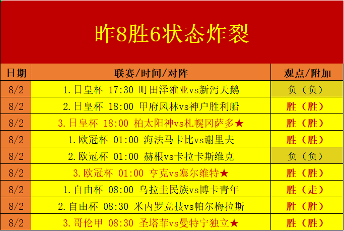 昨日早中晚三个板块均交出优秀的胜利表现,完成的9场比赛取得6胜1走2负的单日胜+4炸裂成绩!8月赛程经历了首日平稳的调整之后重新进入了优势的获胜轨道!本日中坚板块比赛带来欧会杯的赛事组合进行周中的扩展冲击,昨晚的欧冠杯板块拿下了3胜2的优势成绩,本日继续进击欧战区,争取延续本周优秀增长表现再下一城!