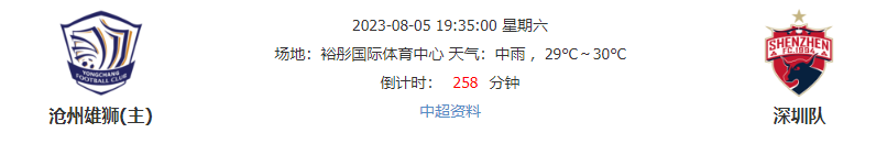 北京时间08月05日19时35分,中超联赛迎来20轮赛事第8场较量:由沧州雄狮坐阵沧州体育场迎战深圳队,防守糟糕的深圳队,加上主力停赛缺阵的雪上加霜,客战还能有奇迹上演吗?