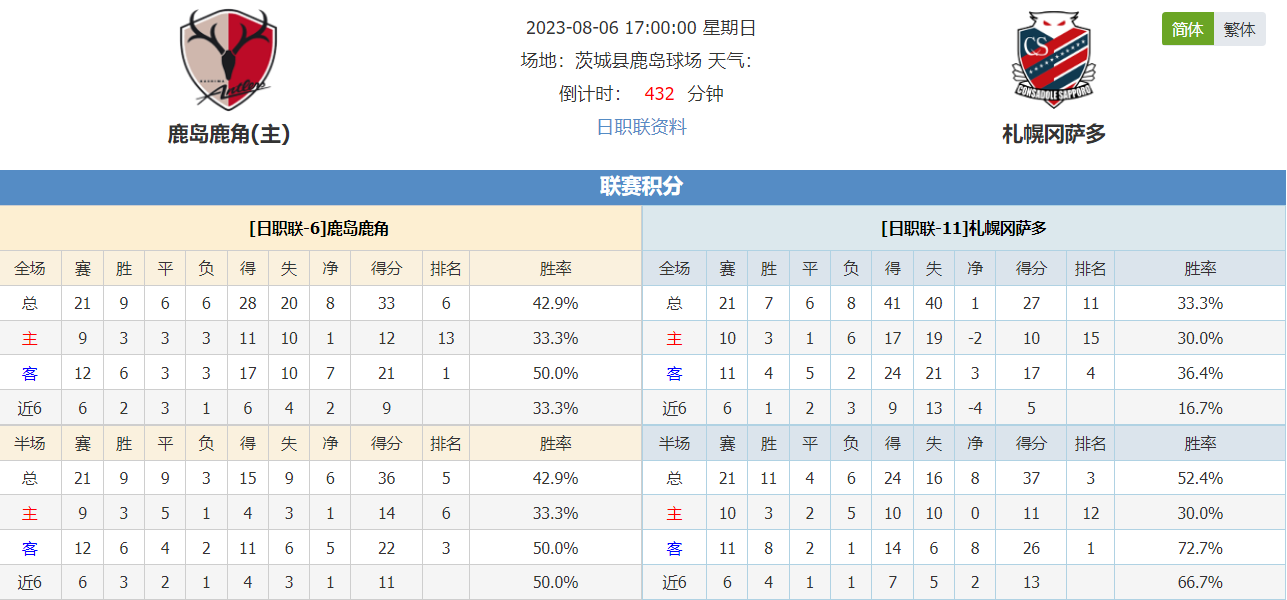 看点:鹿岛鹿角上一场比赛客场3-1战胜FC东京,此役主场作战能否延续出色表现?札幌冈萨多近期遭遇2连败,此役作客能否止住颓势?