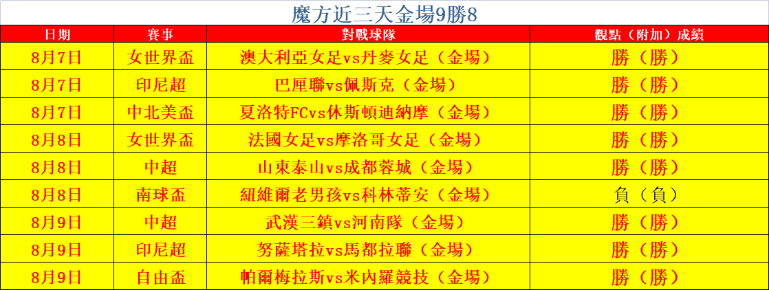 魔方昨日再産正值,整體6勝4,其中金場3戰全勝,中超專場全勝!近三天金場十分出色,打出9勝8的成績!接下來魔方將會不斷努力務求精益求精!今日對澳足總、歐羅巴盃以及南球盃進行深研。
