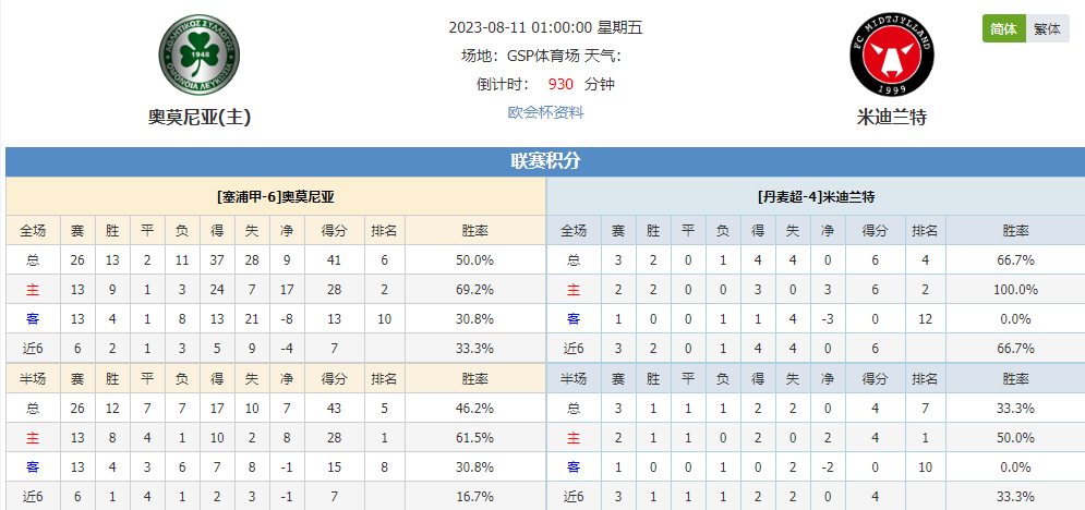 北京时间8月11日01:00,欧会杯第3轮,奥莫尼亚vs米迪兰特。奥莫尼亚拿下二连胜胜绩,如今还是为欧战而努力,他们能否在此役保持状态?米迪兰特遭遇连败状态低迷,当下有双线作战的压力,此役作战谁是更有作为的一方?