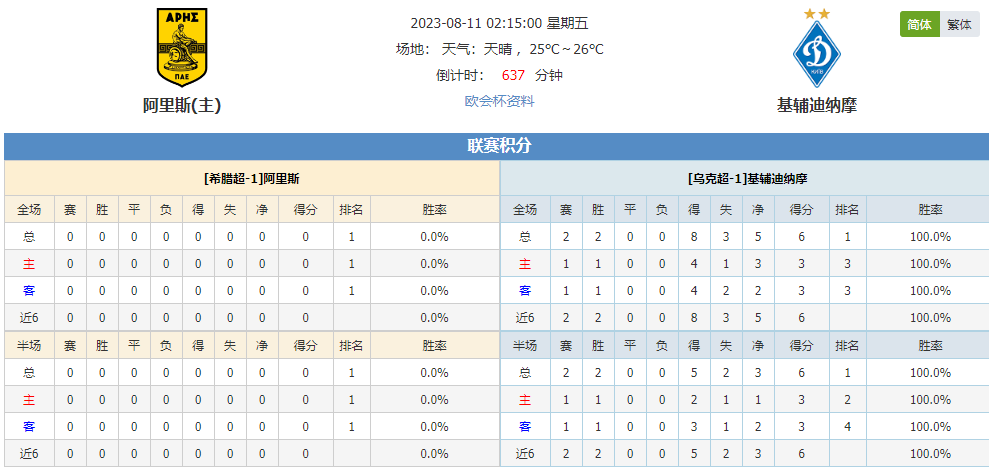 阿里斯在希腊超本赛季的26轮比赛成绩为12平4平10负,拿到了一个欧战名额。目前总积分为40分,排在联赛的第5名。联赛总进球为38球,进攻端也是积极的表现,总失球为24球,他们的防线表现显得平庸。阿里斯上一役联赛对战阿拉特阿美尼亚,终以1:0战胜对手,在主场成功建立了优势。阿里斯与基辅迪纳摩历史还未有过交战,此役首战能否拿下佳绩?