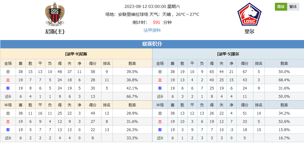 北京时间08月12日03:00,2023-2024 法国甲组联赛,尼斯vs里尔,新赛季开局,两队上赛季以第5、9名名次收官,今天新赛季开局哪一队更胜一筹?
