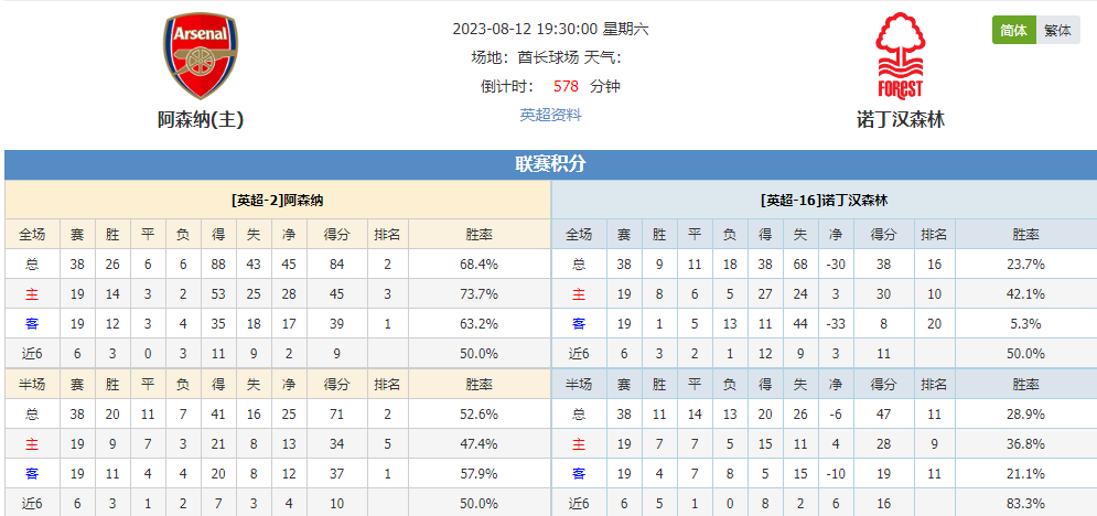 综合分析:诺丁汉森林本赛季在英超排在第16位,本赛季的诺丁汉森林表现平庸,目前维持着不胜的表现,而诺丁汉森林在联赛下游,如今在联赛也是力求保级,球队主客两端表现出明显的主强客弱,上一仗客场挑战法兰克福,终以0:0战平对手,在赛场上也能看得出来诺丁汉森林锋线表现乏力,防线开始变得稳固。而诺丁汉森林在上役交手与阿森纳交手继续落败,他们仍是需要全力以赴。