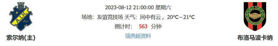 北京时间2023年8月12日21:00,瑞典超2023赛季第19轮比赛,索尔纳vs布洛马波卡纳,主队近期持续交出复苏表现摆脱联赛的降级阴霾,本次回到主场能否为球迷带来久违的胜利打破主场不胜的僵局?客队重回瑞典超之后火热赛程已过,近期状态低迷之下能否找回赛季初期的遇强越强的心气?让我们一起拭目以待!