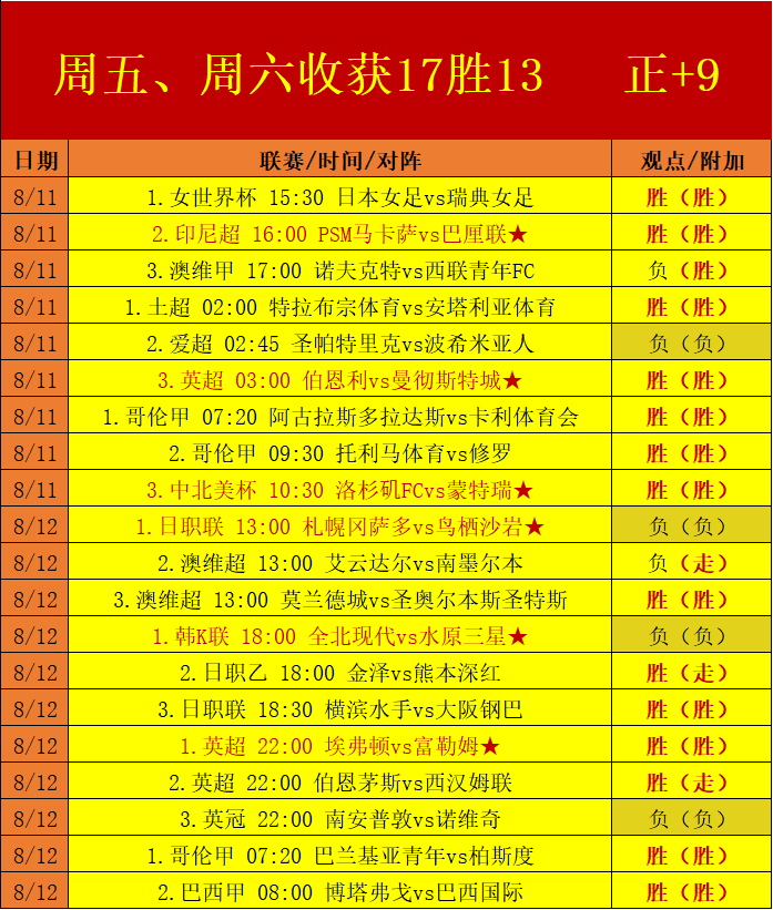 昨日已完成的11场比赛收获5胜3走3负的稳定上升成绩,延续了周五优势冲刺的进程,两天时间合计收获了胜+9的的胜利增长表现,同时也将7-8月的双月成绩提升到了净+46的收获进程!本日是周末收官的蕞后一天时间,首个先锋板块带来昨日发挥稳定的亚系赛事澳维超+印尼超组合精选出击,争取延续本次踏入的胜利进程进一步扩展优势成绩单!