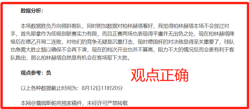 一、战绩回顾:这两天状态正佳,取下2连的战绩,昨天德国杯顺利打出观点,柏林赫塔取下大胜,虽然数据浅开,但笔者认识到了浅阻,打出了正确的方向。