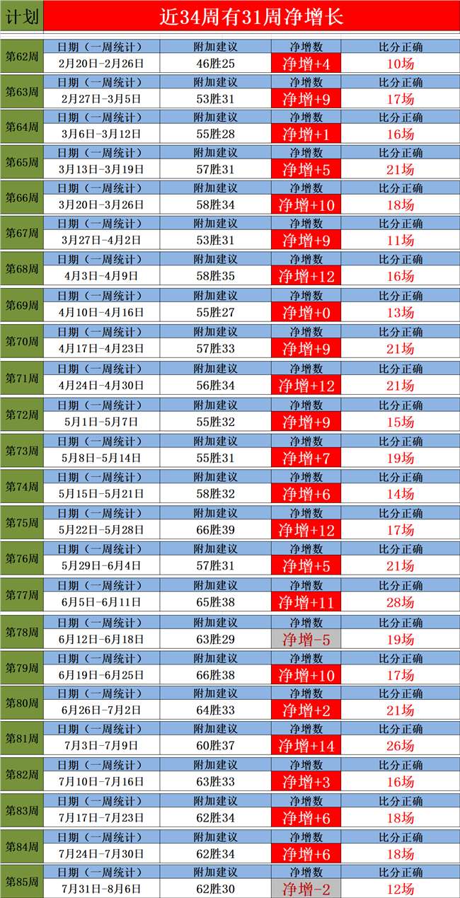 2、上周净增+6场,近33周有31周保持净增长,上周预测18场比分正确,持续的保持了高效的稳定。