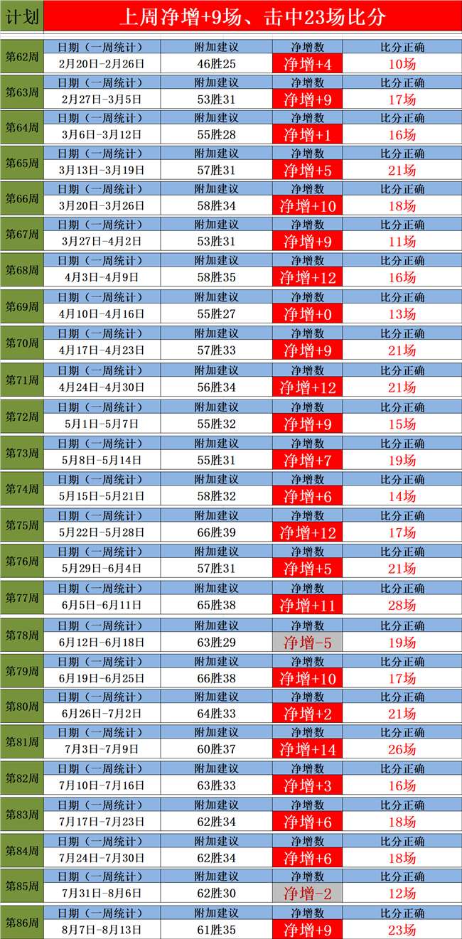 2、上周净增+9场,近34周有32周保持净增长,上周预测23场比分正确,持续的保持了高效的稳定。