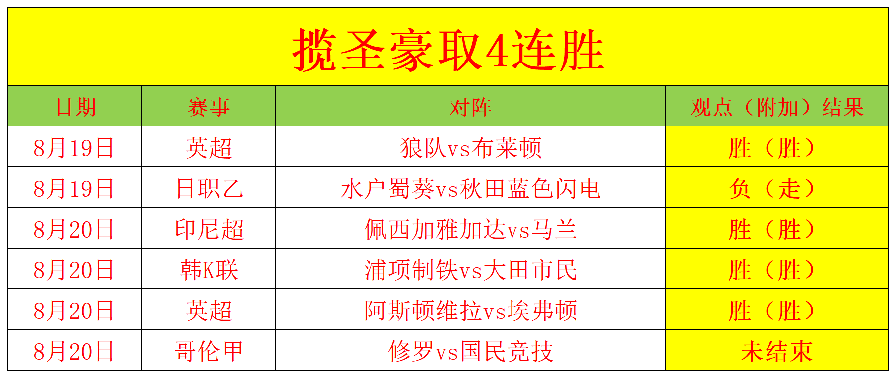 昨天4场比赛已经打出了3场,剩余一场哥伦甲未结束,近期再次豪取4连胜(走的不纳入统计),笔者状态再度飙升,今天乘胜追击。足球比赛是追求长期的稳定,长期的关注才能得益,一时的下滑并不意味着失败,大家不要因为一时的下滑而放弃关注,笔者会努力挖掘更精准的赛事分享给大家,感谢大家的支持。