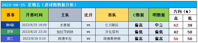 大数据栏目:本栏目将当天的赛事列出经由大数据分析得出的任何高概率选项供网友参考(期间若连续2天总胜率低于50%,将免费1期补偿)。现时大数据分析逐渐融入我们的生活当中,任何一个动作都能参照历史数据得出下一个行为是什么。足球作为一项竞技体育赛事,自然也离不开大数据的分析,在可供查找的数据中我们可以经过特殊的算法得出赛事的某些选项高频概率,而本栏目正是因此而创建。