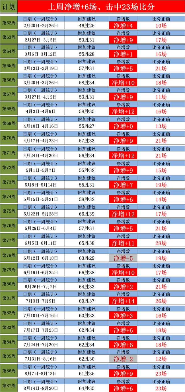 2、上周净增+6场,近35有33周保持净增长,上周预测23场比分正确,持续的保持了高效的稳定。