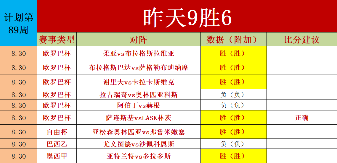 1、推演士计划第89周(走不纳入统计)早上的墨西甲也顺利的打出了,昨天状态炸裂,昨天合计9胜6,首先是欧罗杯打出了6胜4的佳绩,然后早上的美洲比赛3胜2,欧罗巴杯依然保持高胜率,近16胜13的战绩,终于等到了笔者的重中之中五大联赛了,今晚五大联赛已经做好了完全的准备。