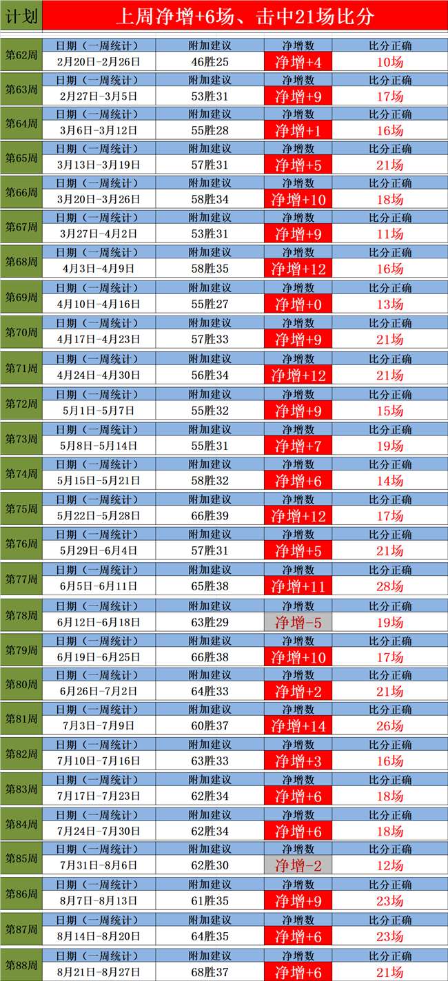 2、上周净增+6场,近36有34周保持净增长,上周预测21场比分正确,持续的保持了高效的稳定。