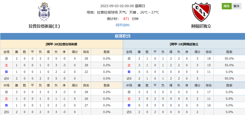 北京时间09月02日02:00,2023 阿根廷甲级联赛,拉普拉塔体操vs阿根廷独立,阿甲联赛来到第二阶段,两队近期去表现有所下滑,今天比赛谁能更胜一筹?