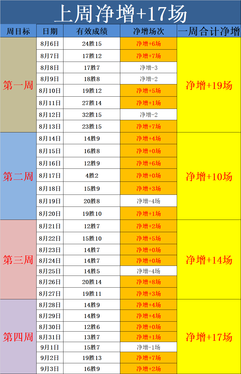 精彩分享:昨天周日继续狂胜,剩下3场比赛在进行未统计,昨天有效成绩16胜9,净增+2场,周末两天一共拿下了净增+9场的战绩,上周已经结束了,上周又是狂胜的一周,上周一共下来净增+17场,实行计划以来,四周都完成了净增目标,而且净增场次都达到了两位数以上,截止目前,从8月6日至今共4周,净增长高达60场,今天我们继续向更高的目标推进。