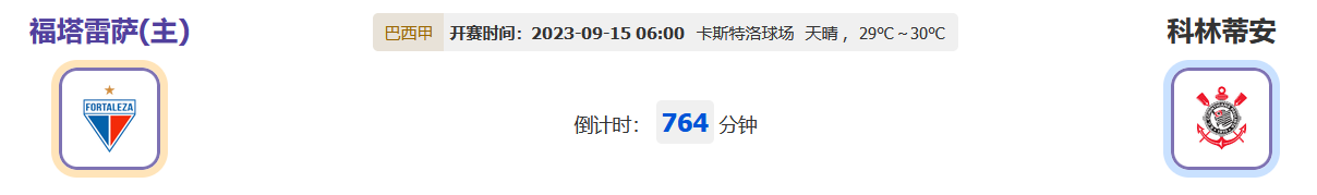 北京时间2023年9月15日06时00分,巴西杯2023赛季第23轮比赛,福塔雷萨vs科林蒂安,主队上战遭到阻击连续抢分进程中断,此番回到主场能否迅速回到胜轨?客队近期状态渐入佳境联赛多轮不败,此番作客能否得到延续扩充优势?让我们一起期待!