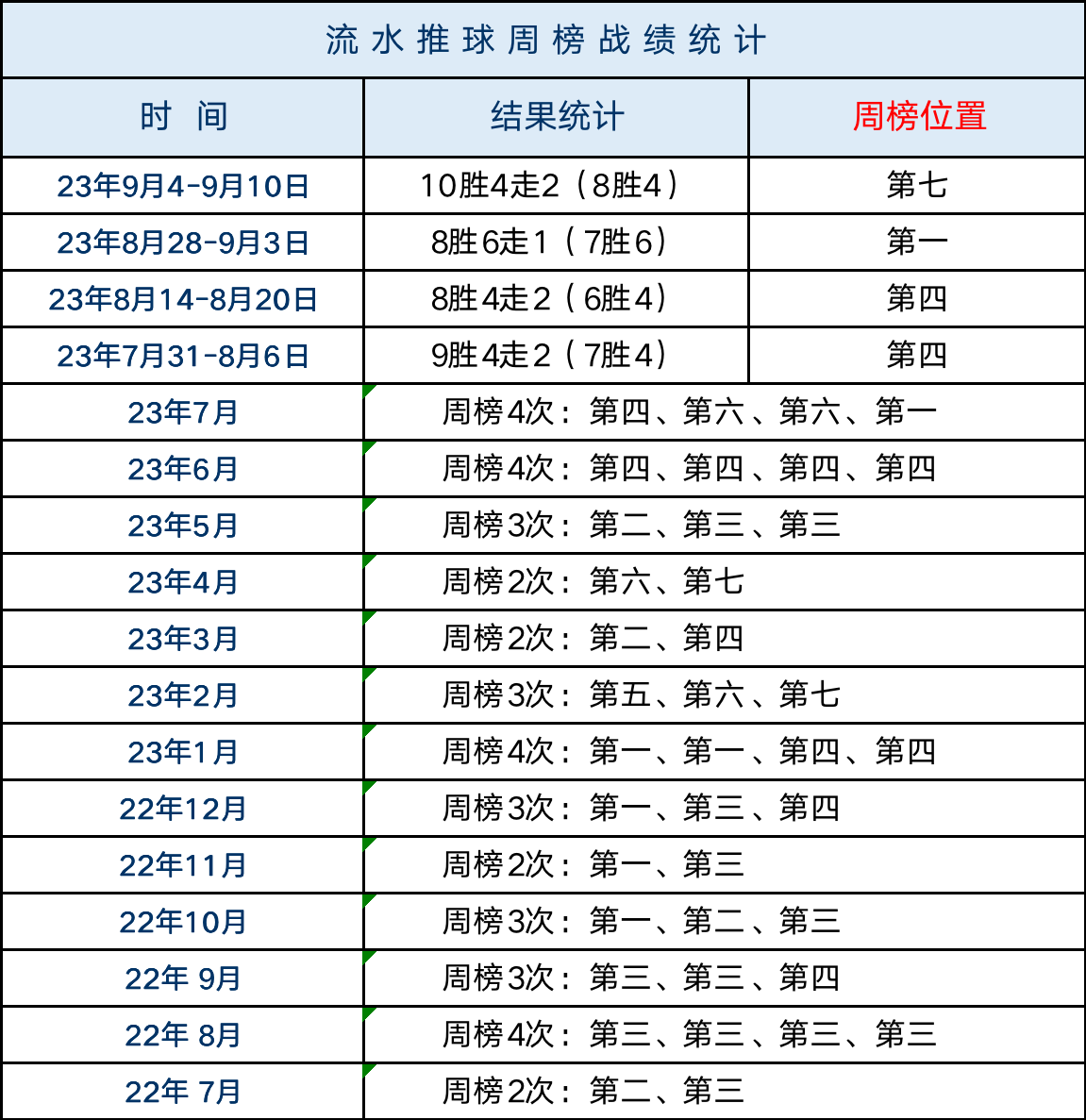 22年7月18-9月18,连续8周均入列周榜前四,其中7次前三;