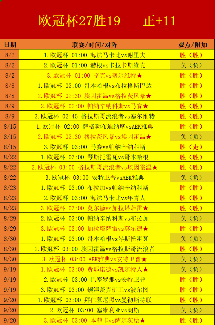 昨日已完成的8场比赛收获4场稳定胜利成绩,继10月首日获得正增之后继续交出正向不败的对赛表现,目前9-10月的双月增长进度保持在正+23的正向增长区间,本日中坚的欧赛板块精选欧冠杯+英超联赛组合出击,欧冠杯在过去2个月时间连续赛程发挥精彩,取得27胜19正+11的优质增长成绩,而英超联赛作为主要的五大联赛板块同样保持着稳定的成绩发挥,继续强强联手,争取延续双月优势和10月增长势头继续扩大优势成绩单!