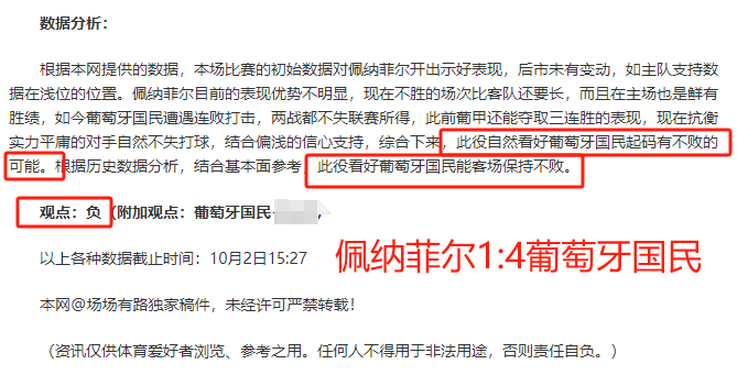 (温馨提示:观点回顾为已完场赛事的统计,并不能代表未来的观点预测结果走势,观点仅为其个人意见,与平.台无关。资讯仅供体育爱好者浏览,并不构成购.彩建议,任何人不得用于非法用途,请广大用户理性消费。)