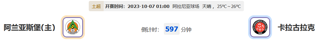北京时间2023年10月07日01时00分,土超联赛2023-2024赛季第8轮比赛,阿兰亚斯堡vs卡拉古拉克,两队赛季开启至今的前场表现始终颓弱,难以得到支持下在下半区的位置里苦苦挣扎未能与保级名次拉开差距,此番对阵会是怎样的一个局面?让我们一起期待!