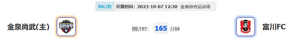 北京时间10月07日12:30,韩K2联2023赛季第35轮比赛,金泉尚武vs富川FC,主队赛季表现高开低走前段时间积分进度延缓之下被釜山偶像反超失去了榜首的优势,近期重新回到胜轨状态的主场能否信任?客队目前也是K2联赛具备争抢升级位置的竞争对手之一,此番作客能否在关键抢分战中全身而退?让我们一起关注!