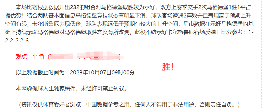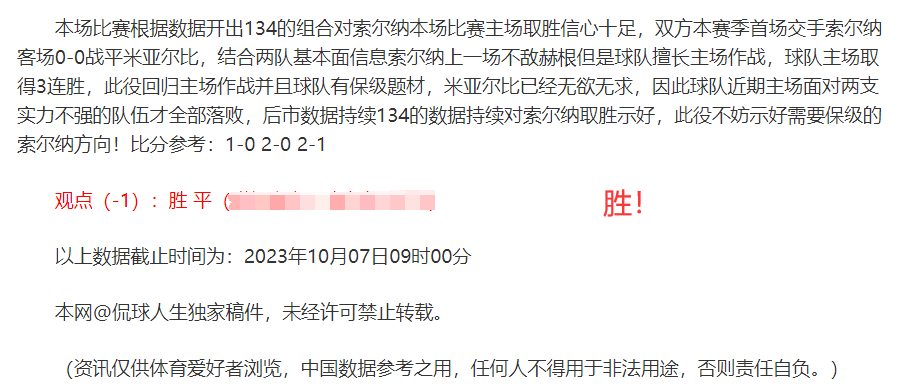 (温馨提示:观点回顾为已完场赛事的统计,并不能代表未来的观点预测结果走势,观点仅为其个人意见,与平.台无关。资讯仅供体育爱好者浏览,并不构成购.彩建议,任何人不得用于非法用途,请广大用户理性消费。)