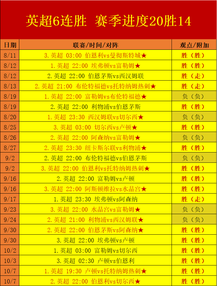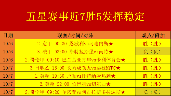 昨日有不少比赛受到场内客观因素影响导致与胜利方向有所偏离,数据脚步有所放缓,不过作为主要方向支撑的五星赛事依然逆势交出了精彩的发挥,单日取得4胜3的精彩成绩收获,进入周末收官阶段取得7胜5的稳定发挥,本日中坚欧洲赛事继续挖掘值得信任的比赛数据进行整合,昨天英超赛程继续交出稳定的数据表现取得2战全胜的优质增长,英超联赛开季至今取得20胜14的优秀增长表现,目前更是处于6连胜的火热增长走势,携手优质赛程板块,争取在前面常规赛程的调整后携手五星支撑迅速回到优势的前进状态!