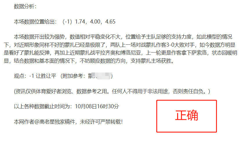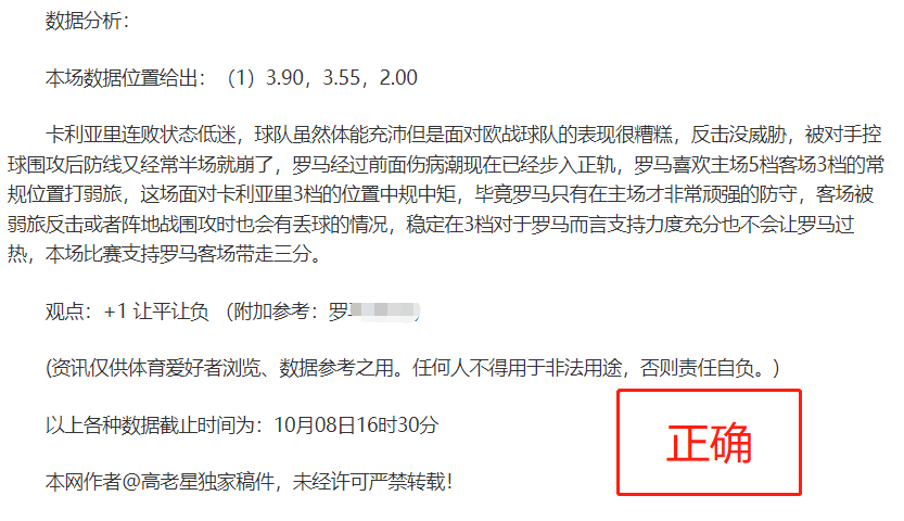 (温馨提示:观点回顾为已完场赛事的统计,并不能代表未来的观点预测结果走势,观点仅为其个人意见,与平.台无关。资讯仅供体育爱好者浏览,并不构成购.彩建议,任何人不得用于非法用途,请广大用户理性消费。)