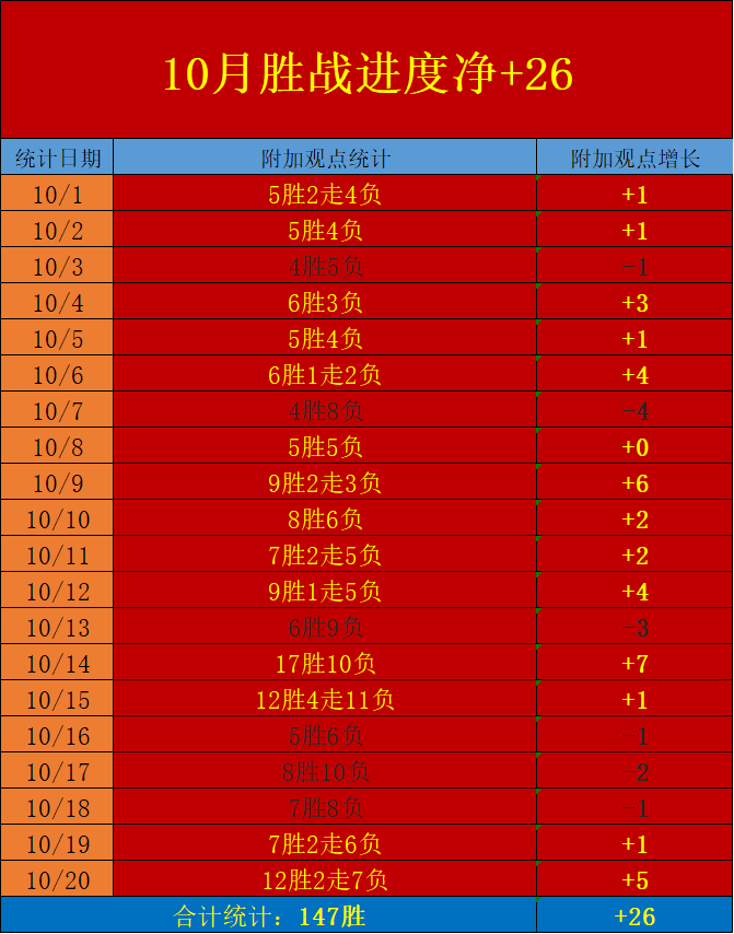昨日已完成赛程取得12胜2走的精彩观点分享,单日收获胜+5的优质增长进度,新版数据继续保持稳定的向上冲击能力!10月赛程经历微弱调整后重新回到连续增长轨道,目前胜战进度已拿下147胜,净+26的优质峰值体验,成功以正向稳定的步伐迈进10月的下半旬冲刺,继续保持对优质数据的持续追踪,争取10月成绩单继续冲击更高峰值!
