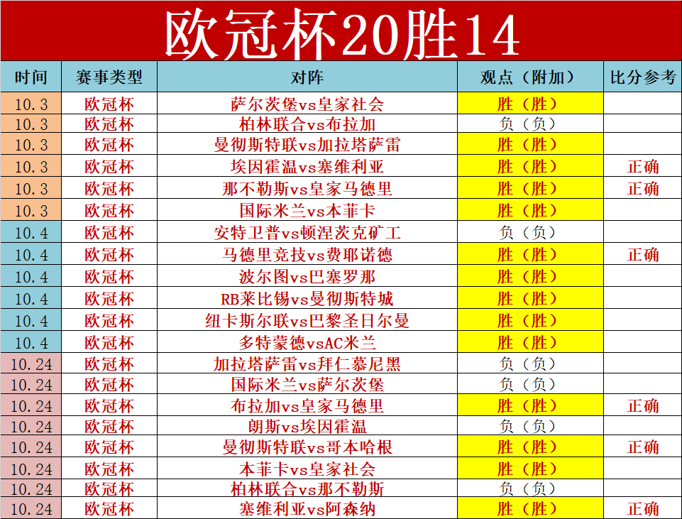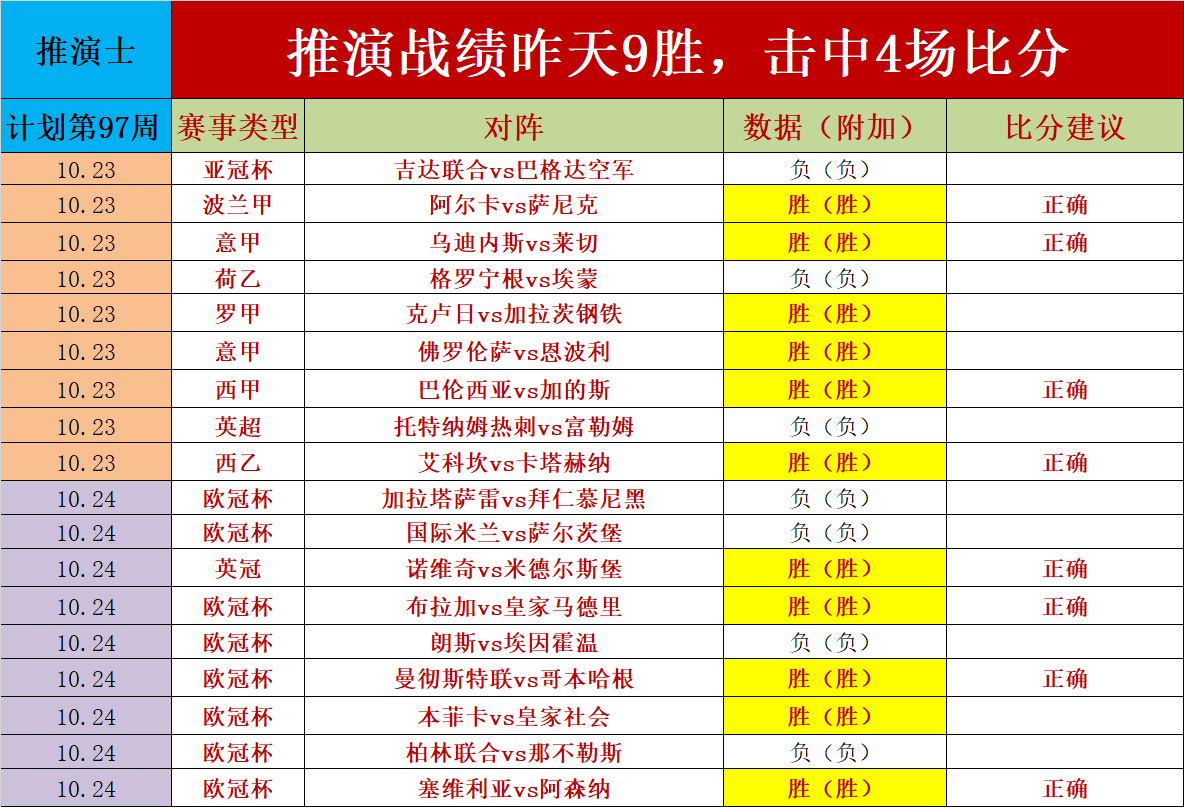1、推演士计划第97周(走不纳入统计)昨天保持炸裂的状态,拿下了9胜5的佳绩,值得一提的是,击中了4场比分,两天共击中了6场比分,昨天的的战绩含金量非常高,今天继续欧冠杯,欧冠杯近期的战绩20胜14。