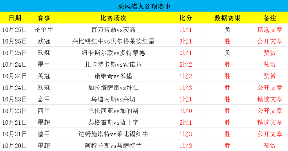 成绩长期稳定,状态火热!公开文章4连胜+各项11胜9!昨公开文章莱比锡红牛3:1贝尔格莱德红星,进球数成功拿下,之后赞赏纽卡斯尔联遗憾未能拿下,精选哥伦甲也中断了连胜,今日重新再出发,力争大捷,全力大胜起飞,欢迎赞赏!——今日重点参考乘胜追击!老铁们一起冲!