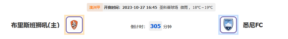 北京时间10月27日16:45,澳洲甲比赛,布里斯班狮吼vs悉尼FC,两队新赛季首轮比赛未尝一胜,今天比赛两队相遇会有怎样态度呢?