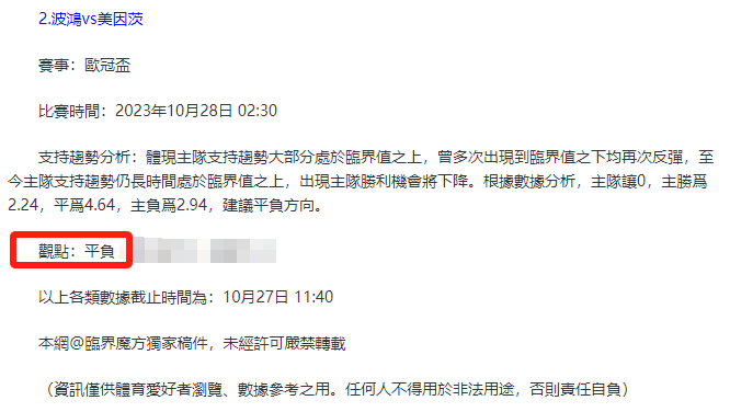 【解鎖內容為以上賽事支持趨勢預測圖展示,以及根據分析預測圖進行相對低機率方向觀點判斷。解鎖內容僅代表個人知識領域觀點,與本網站無關】