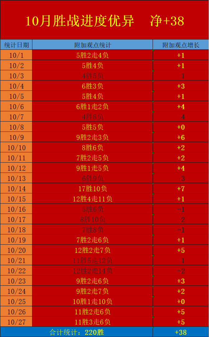 昨天完成的20场赛事取得11胜3走的优质表现,延续了近期火热的数据上升能力,单日进程收获净+5的优质增长!本周周中赛程连续保持5天精彩数据发挥合计取得周净+15的优势支持进程!10月累积获得胜利场次已达到220场之多,当中转化净值+38表现炸裂,进入10月下半旬冲刺之后携手新版数据模块助力持续升温!本月赛程余下4天可以迈向更高峰值冲刺,精彩赛事不容错过!