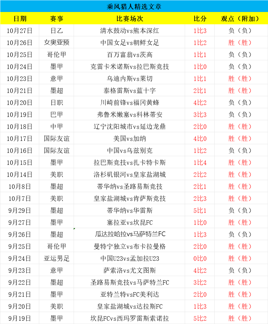 大家好,我是乘风猎人,职业数据分析师,足球经验丰富,研究足球数据数十载,期望能够乘风破浪,精准猎球制胜,欢迎朋友们长期关注!