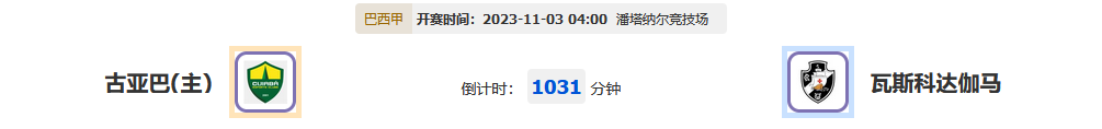 北京时间11月03日04:00,2023 巴西甲组联赛,古亚巴vs瓦斯科达伽马,古亚巴排在联赛第11位的位置,今天面对状态一般的瓦斯科达伽马能否捍卫主场呢?