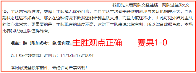 (温馨提示:观点回顾为已完场赛事的统计,并不能代表未来的观点预测结果走势,观点仅为其个人意见,与平.台无关。资讯仅供体育爱好者浏览,并不构成购.彩建议,任何人不得用于非法用途,请广大用户理性消费。)