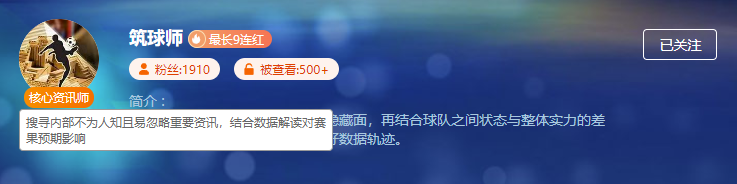 您们好!我是筑球师。很高兴能在这里与伙伴们交流足球的心得。本人多年钻研足球冷热数据,擅长于分析数据波动的隐藏面,再结合球队之间状态与整体实力的差异化,相对精准地捕捉赛事的利好数据轨迹。接下来的日子筑球师与伙伴们一起享受足球带给我们的快乐!搜寻内部不为人知且易忽略重要资讯,结合数据解读对赛果预期影响。