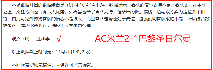 昨天公推的欧冠杯稳稳拿住,AC米兰2-1巴黎圣日尔曼,笔者分析的主队方向准确无误,今天乘胜追击。