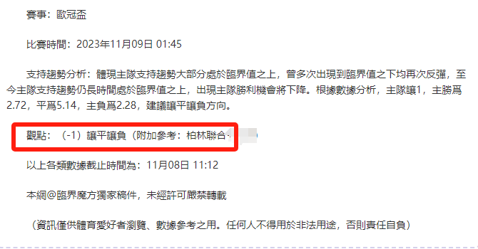 溫馨提示:觀點回顧為已完場賽事的統計,並不能代表未來的觀點預測結果走勢,觀點僅為其個人意見,與本網站無關。資訊僅供體育愛好者瀏覽,並不構成購.彩建議,任何人不得用於非法用途,請廣大用戶理性消費。