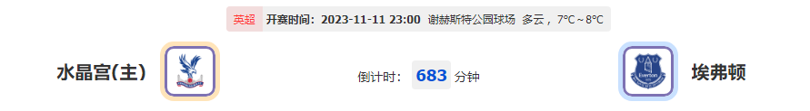 北京时间11月11日23时00分,英超的一场焦点比赛,水晶宫vs埃弗顿,水晶宫上一场比赛客场斩获胜仗,成功止住连败颓势,士气正盛,此役主场迎战近期状态不错的埃弗顿,水晶宫能否继续获胜?